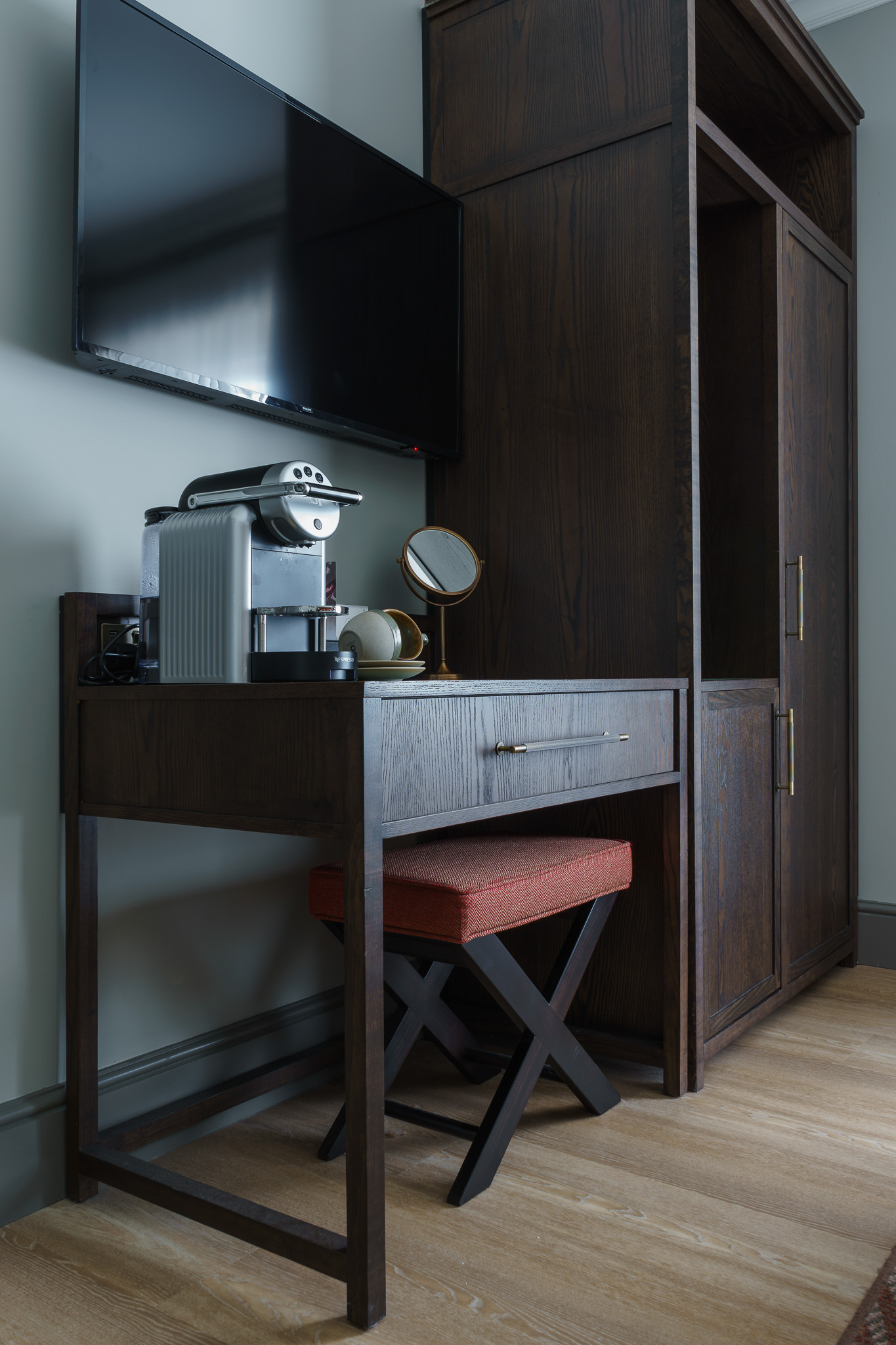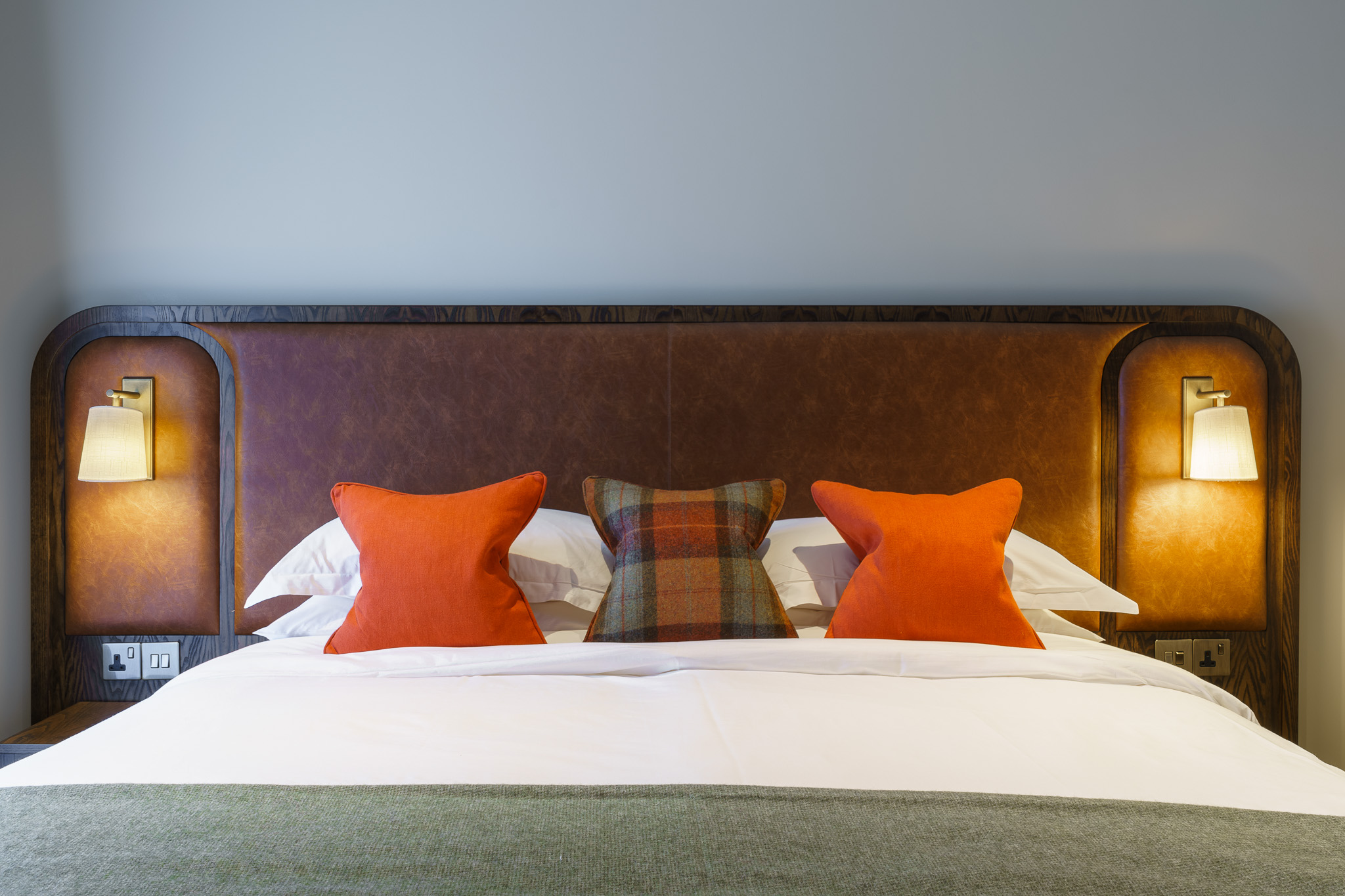 Our workshop excels at creating hotel casegoods at scale without compromising on quality or style. For this project, we produced a range of stunning bedroom and en-suite furniture, including headboards, bedside tables, desks, minibar units, wardrobes, and vanity units with a mid-dark oak finish. Each piece seamlessly blends with The Leddie’s stylish new look while allowing for the flexibility of different bedroom layouts.