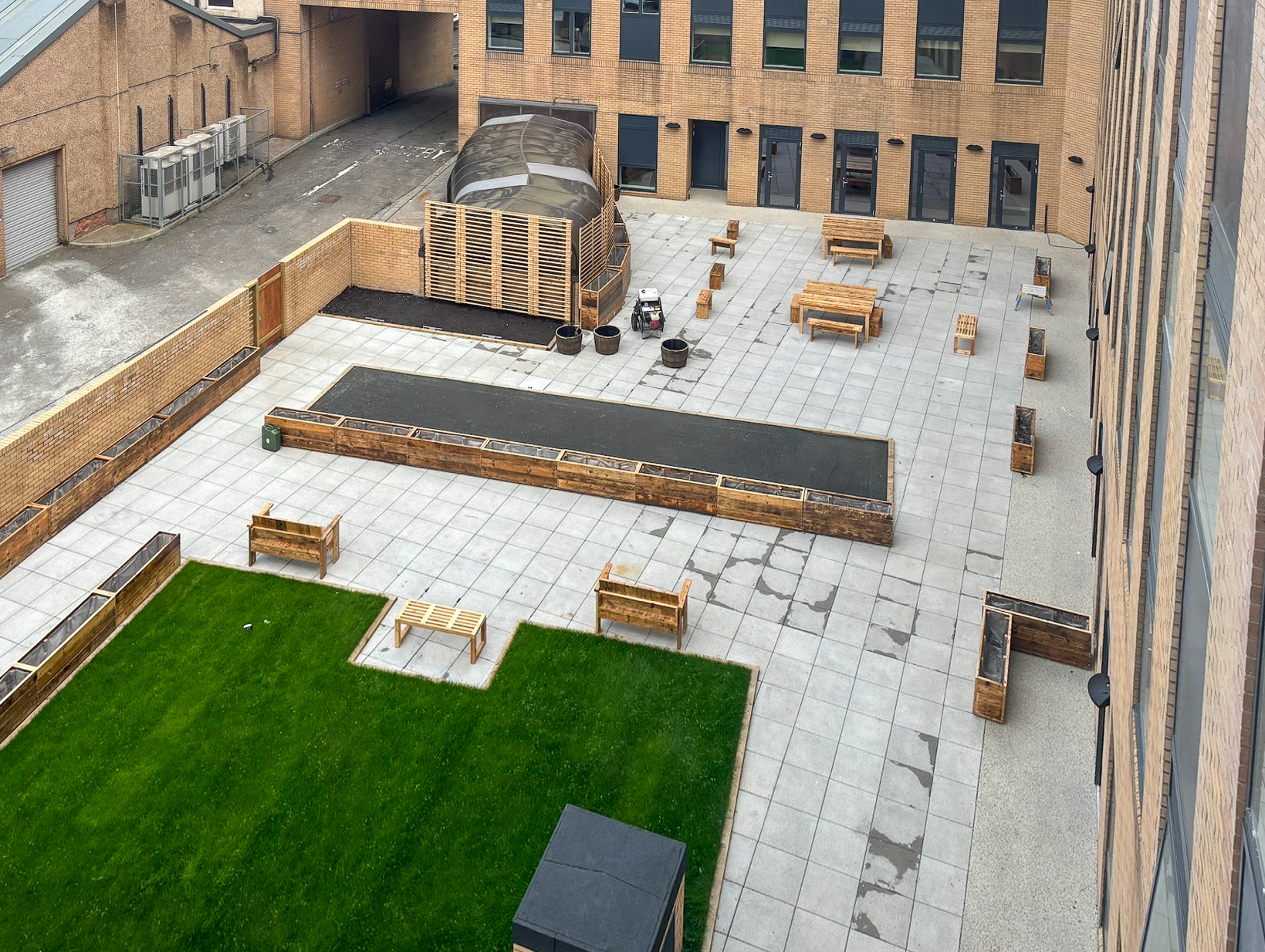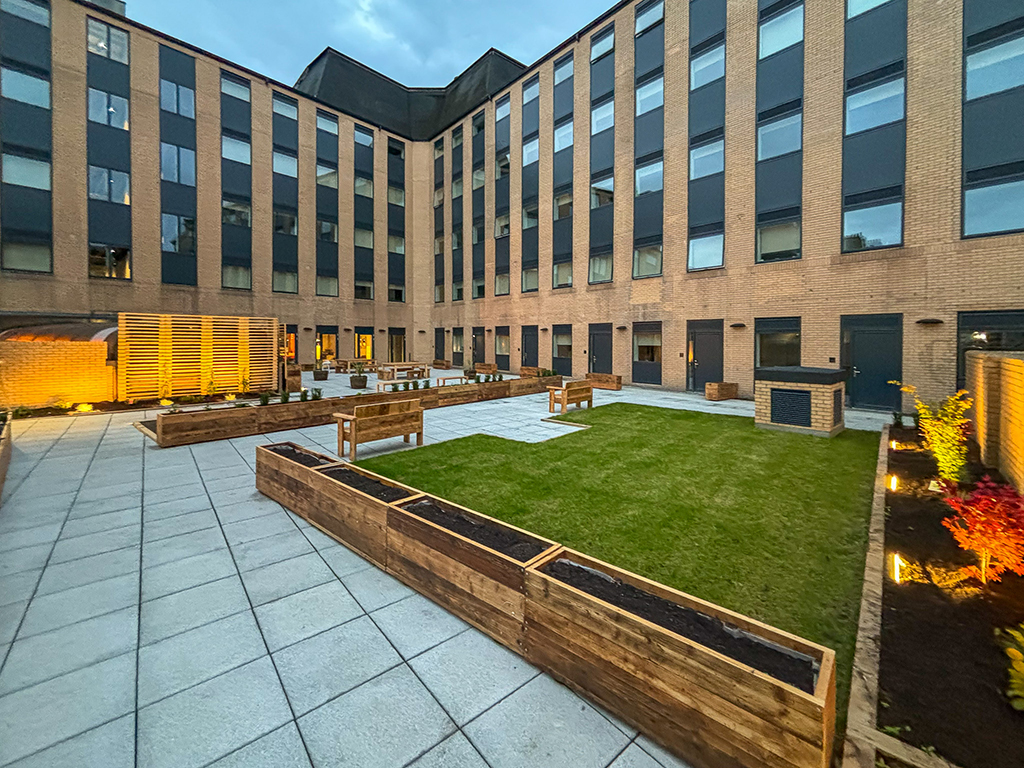 Dalian House features a striking contemporary industrial design, with open ceilings in black-painted corridors exposing coloured pipes and wiring and concrete floors treated for durability. The building’s exterior has been revitalized with new glazing and landscaping, creating an inviting atmosphere. Additionally, a communal garden above the car park provides a serene urban retreat for residents.