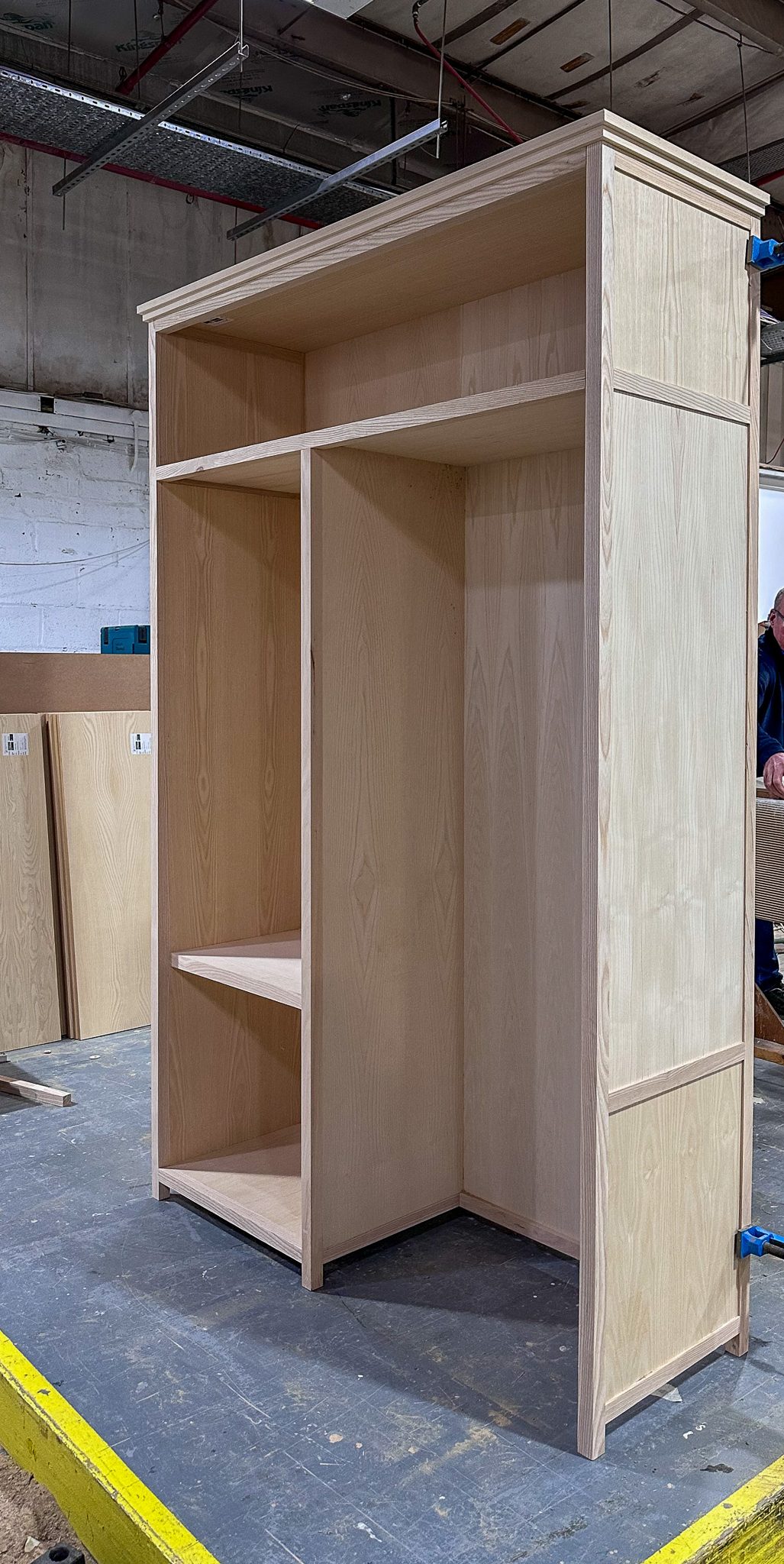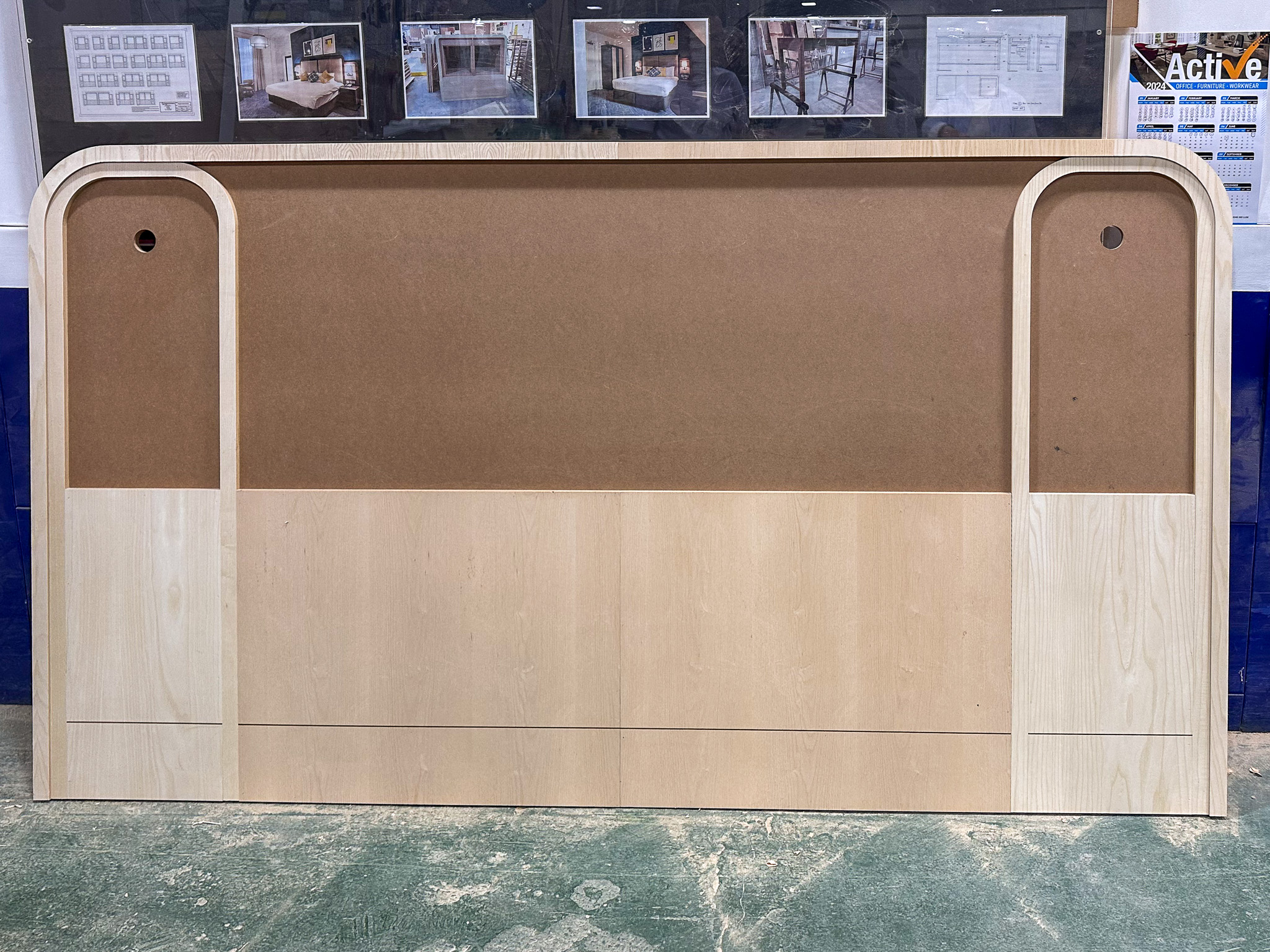 Our team crafted custom desks, vanities, and dressing tables, all in rich mid-dark oak with green Forbo linoleum insets. The new reception desk sets the tone upon entry, while guest rooms feature wardrobes and headboards made from ash-veneered MDF with padded fabric inserts for comfort.