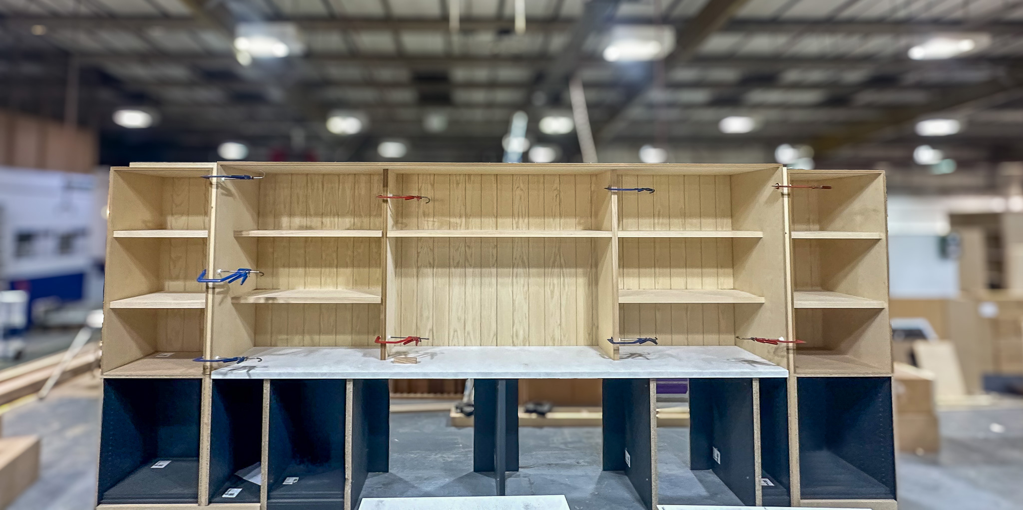 In the bar area, a bespoke back gantry and front bar, topped with Hi-Macs in ‘Belizzi,’ reflect the same materials as the guest room furniture. Dining tables were updated with matching stains and Corian centrepiece inserts. Mirrored banquet seating, joined with a ‘birdsmouth’ technique, adds visual interest and reflects our commitment to quality.